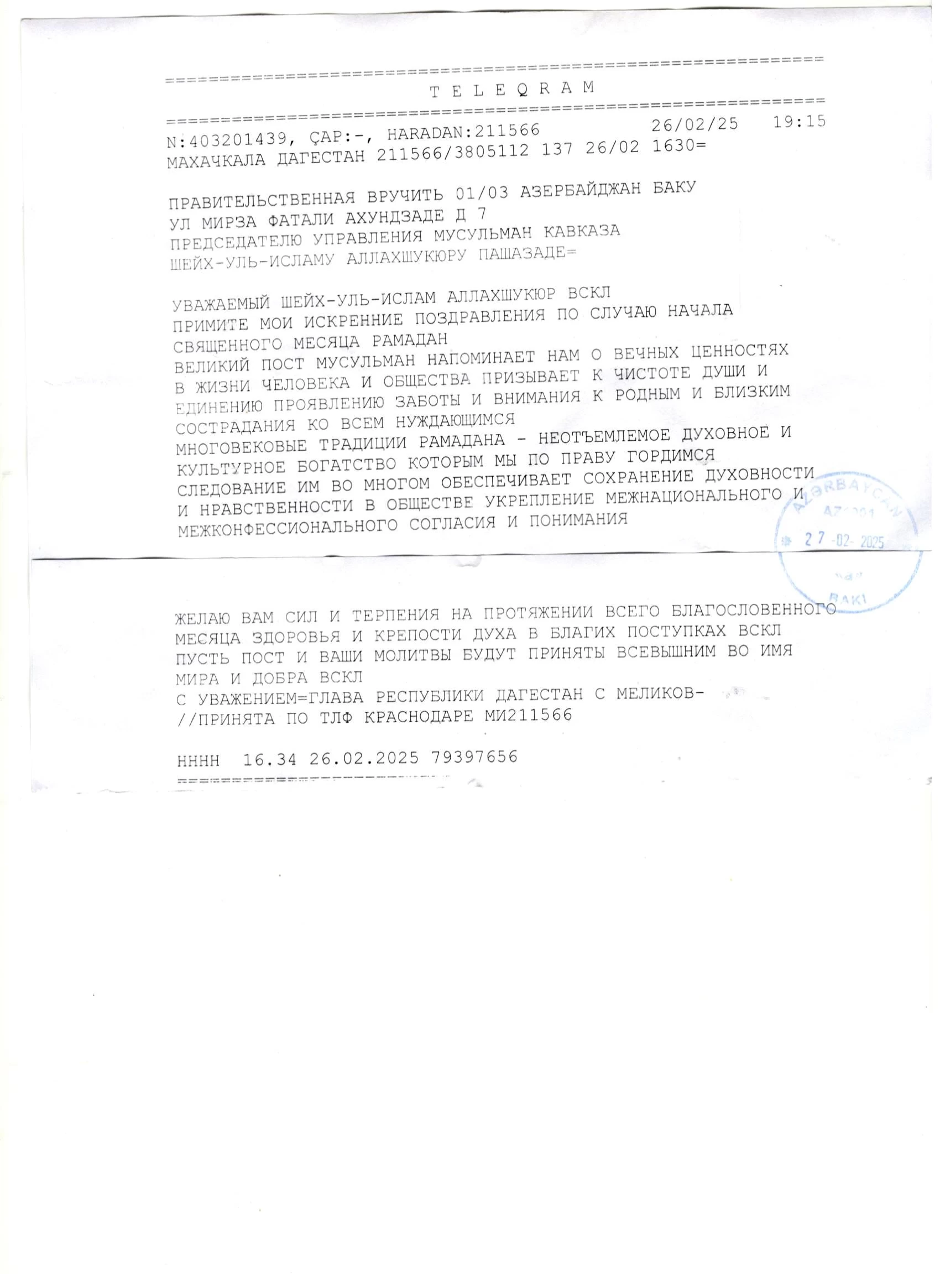 Rusiya Federassiyası Dağıstan Respublikasının rəhbəri Sergey Melikovdan təbrik məktubu: 26.02.2025